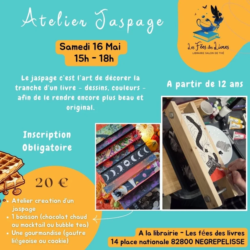 Attention, le nombre de participants est limité pour garantir un accompagnement personnalisé. Par conséquent, l‘inscription est obligatoire. Pour réserver, contactez nous rapidement ou passez nous voir au 14 place nationale à Nègrepelisse. Toutefois, si vous avez un livre spécifique à jaspé, n’hésitez pas à nous le signaler. Par ailleurs, retrouvez tous nos événements sur lesfeesdeslivres.fr.