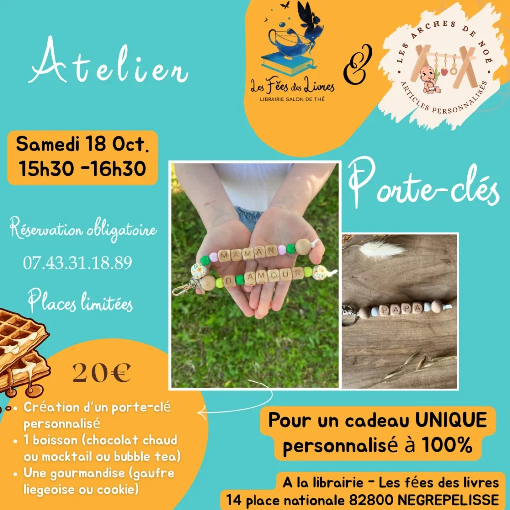 La librairie Les Fées des Livres à Nègrepelisse continue de faire briller la créativité des plus jeunes ET des grands avec un nouvel atelier ludique et coloré ! Le samedi 18 septembre 2025, de 15h30 à 16h30, vous êtes invités à participer à un atelier créatif “Porte-clé personnalisé” animé par la talentueuse Audrey de « Les Arches de Noé ».